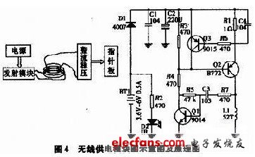 ??? 供電電路如圖4所示,采用無(wú)線(xiàn)供電模塊,具有無(wú)觸點(diǎn)、噪聲小、壽命長(zhǎng)的特點(diǎn)。在線(xiàn)圈距離很近的情況下,輸出效率很高。其中L1是發(fā)射線(xiàn)圈,接收端需要一個(gè)接收線(xiàn)圈,經(jīng)整流穩(wěn)壓后接入指針板的單片機(jī)和時(shí)鐘芯片.