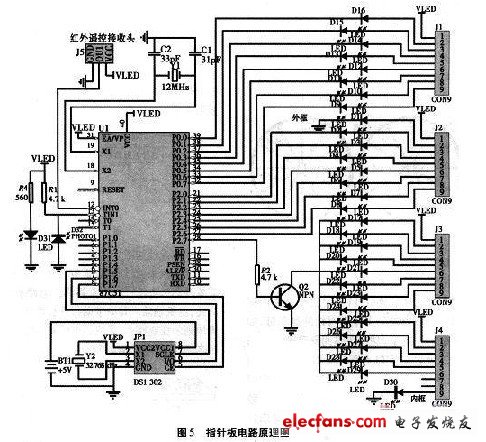 ??? 為使指針板輕巧,采用貼片式LED。本時(shí)鐘需要能顯示“12、3、6、9”這四個(gè)整點(diǎn)數(shù)字和秒針、分針、時(shí)針,用7支LED燈顯示數(shù)字,21支用來(lái)顯示秒、分、時(shí)三針,另外再加一支內(nèi)框一支外框燈,總共30支LED燈。為了節(jié)省單片機(jī)I/O管腳,并不是每支LED燈都由一個(gè)I/O管腳控制的。為了滿(mǎn)足驅(qū)動(dòng)電流,加一支三極管來(lái)驅(qū)動(dòng)。為使顯示穩(wěn)定,在指針板上加裝一個(gè)紅外接收管,當(dāng)接收到與之配對(duì)的紅外發(fā)光二極管發(fā)出的紅外線(xiàn)后,就會(huì)反向?qū)?,接到單片機(jī)外部中斷。有了這個(gè)信號(hào),單片機(jī)就可以在指針板旋轉(zhuǎn)過(guò)程中實(shí)時(shí)檢測(cè)計(jì)算指針板的角度位置,并根據(jù)指針板所處的不同位置,點(diǎn)亮相應(yīng)的LED。