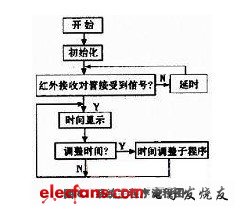 ??? 旋轉(zhuǎn)時(shí)鐘軟件設(shè)計(jì)首先是各種初始化及DS1302的初始時(shí)間設(shè)定,然后單片機(jī)采用查詢(xún)方式查詢(xún)P3.3是否接收到了中斷信號(hào)。接收到中斷說(shuō)明指針板已經(jīng)旋轉(zhuǎn)到起點(diǎn)。查詢(xún)到之后先讀取DS1302的時(shí)間,然后顯示到LED。當(dāng)有紅外遙控信號(hào)調(diào)整時(shí)間時(shí),紅外接收頭HS0038將接收到紅外遙控器發(fā)出的紅外脈沖,會(huì)以下降沿的方式給單片機(jī)一組下降沿脈沖中斷信號(hào),單片機(jī)接收到脈沖后,通過(guò)編程和定時(shí)器,記錄每一個(gè)脈沖的脈寬,實(shí)現(xiàn)對(duì)各種信號(hào)的識(shí)別,實(shí)現(xiàn)時(shí)鐘時(shí)間的調(diào)整。系統(tǒng)主程序流程如圖6所示。