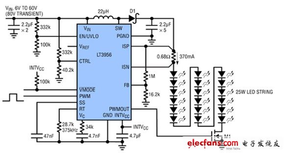 如今,一個25W白光LED車前燈可以采用由18個串聯(lián)LED組成的陣列來配置,使350mA的電流流過這些LED以產(chǎn)生所需的光輸出。不過,如何高效和簡單地驅(qū)動這樣一種配置,這是設(shè)計師所面臨的一個重大障礙。由凌力爾特公司近期推出的LT3956單片式LED驅(qū)動器是一種可行的解決方案。LT3956是一款DC/DC轉(zhuǎn)換器,專為充當(dāng)一個恒定電流和恒定電壓調(diào)節(jié)器而設(shè)計。它非常適合于驅(qū)動大電流、高亮度LED(見圖1)。