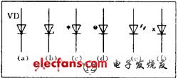 半導(dǎo)體二極管在電路圖中的圖形符號(hào)見(jiàn)圖 12 。其中( a )為一段二極管的符號(hào),箭頭所指的方向就是電流流動(dòng)的方向,就是說(shuō)在這個(gè)二級(jí)管上端接正,下端接負(fù)電壓時(shí)它就能導(dǎo)通。圖( b )是穩(wěn)壓二極管符號(hào)。圖( c )是變?nèi)荻O管符號(hào),旁邊的電容器符號(hào)表示它的結(jié)電容是隨著二極管兩端的電壓變化的。圖( d )是熱敏二極管符號(hào)。圖( e )是發(fā)光二極管符號(hào),用兩個(gè)斜向放射的箭頭表示它能發(fā)光。圖( f )是磁敏二極管符號(hào),它能對(duì)外加磁場(chǎng)作出反應(yīng),常被制成接近開(kāi)關(guān)而用在自動(dòng)控制方面。二極管的文字符號(hào)用“ V ”,有時(shí)為了和三極管區(qū)別,也可能用“ VD ”來(lái)表示。