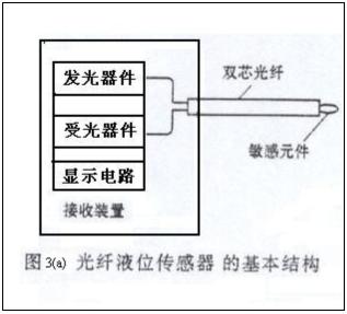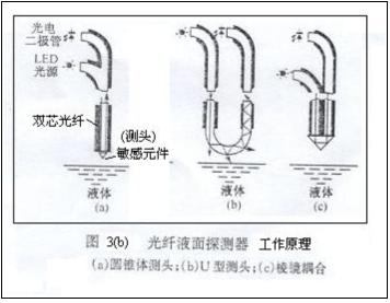 ??????? 圖3(a)所示為光纖液位傳感器的基本結(jié)構(gòu)。這種傳感器的敏感元件和傳輸信號(hào)的光纖均由玻璃纖維構(gòu)成,故有絕緣性能好和抗電磁噪聲等優(yōu)點(diǎn)。