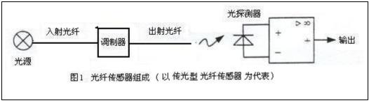 ??????? 光纖傳感器一般是由光源、接口、光導(dǎo)纖維、光調(diào)制機(jī)構(gòu)、光電探測(cè)器和信號(hào)處理系統(tǒng)等部分組成。來自光源的光線,通過接口進(jìn)入光纖,然后將檢測(cè)的參數(shù)調(diào)制成幅度、相位、色彩或偏振信息,最后利用微處理器進(jìn)行信息處理。概括光纖傳感器一般由三部分組成,除光纖之外,還必須有光源和光探測(cè)器兩個(gè)重要部件,見圖1所示。