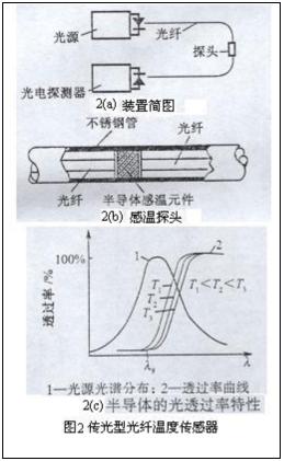??????? 位圖2(a)為半導(dǎo)體吸光型(傳光型)光纖溫度傳感器示意圖。將一根切斷的光導(dǎo)纖維裝在細(xì)鋼管內(nèi),光纖兩端面間夾有一塊半導(dǎo)體感溫薄片(如GaAs或InP),這種半導(dǎo)體感溫薄片透射光強(qiáng)隨被測(cè)溫度而變化。因此,當(dāng)光纖一端輸入一恒定光強(qiáng)的光時(shí),由于半導(dǎo)體感溫薄片透射能力隨溫度變化,光纖另一端接收元件所接受的光強(qiáng)也隨被測(cè)溫度而改變。于是通過測(cè)量光探測(cè)器輸出的電量,便能遙測(cè)到感溫探頭2(b)處的溫度。