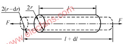??? 當(dāng)它受到軸向力F而被拉伸(或壓縮)時(shí),其l、A和ρ均發(fā)生變化,如圖2-1所示,因而導(dǎo)體的電阻隨之發(fā)生變化。通過(guò)對(duì)式(2-1)兩邊取對(duì)數(shù)后再作微分,即可求得其電阻相對(duì)變化:?