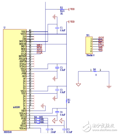MODE[1:0]引腳是用來(lái)設(shè)定MBF200所用接口模式的,在本設(shè)計(jì)中,置MODE[1:0]為01,選定SPI傳輸模式。 在SPI模式當(dāng)中,AIN,ISET,F(xiàn)EST三個(gè)接口都不會(huì)用上,但根據(jù)MBF200內(nèi)部電路結(jié)構(gòu),最好接電阻與地相接。