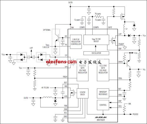 MAX16929是汽車(chē)的TFT - LCD應(yīng)用提供了高度集成的電源。該器件集成了一個(gè)降壓轉(zhuǎn)換器,一個(gè)升壓轉(zhuǎn)換器,一個(gè)1.8V/3.3V穩(wěn)壓器控制器,兩個(gè)柵極電壓調(diào)節(jié)器。