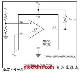 獨(dú)特的輸出級設(shè)計(jì)可以限制開關(guān)時(shí)的電源浪涌電流,從根本上消除了電源擾動(dòng)(普遍存在于其他類型的比較器)。MAX985/MAX989/MAX993具有推挽式輸出級,可以吸收和源出電流。內(nèi)部輸出驅(qū)動(dòng)器在推動(dòng)8mA負(fù)載時(shí)輸出能達(dá)到滿擺幅。MAX986/MAX990/MAX994為開漏輸出級,輸出可被上拉超過VCC,最高可達(dá)到VEE以上6V。這些具有開漏輸出的器件適用于電平轉(zhuǎn)換器和雙極至單端轉(zhuǎn)換器。